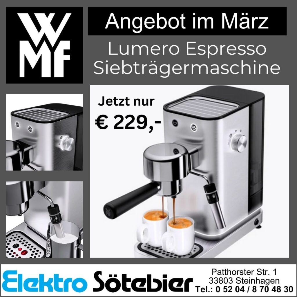 Kompakt und gleichzeitig außergewöhnlich elegant, leistungsstark und dabei kinderleicht zu bedienen – die WMF Lumero Espressomaschine verzaubert Kaffee-Enthusiasten mit stilvollem Äußeren und vollmundigem Espresso mit perfekter Crema. Das Vorheizen dauert dank des leistungsstarken Thermoblock Heizsystems nicht einmal eine Minute und die Maschine ist bereit, mittels der intutiven 2-Tasten-Bedienung Espresso in Barista-Qualität zu brühen. Die integrierte Milchschaumdüse sorgt dazu in Sekundenschnelle für jede weitere, gewünschte Espresso-Variante – vom seidig-sanften Macchiato bis zum unwiderstehlich-cremigen Cappuccino.